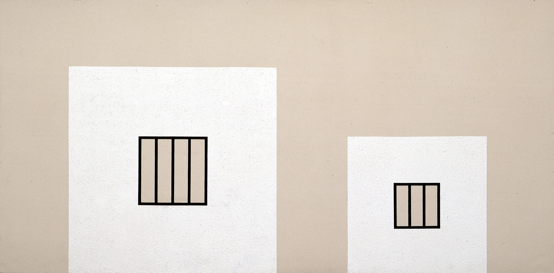 Since the early 1980s, Peter Halley has focused a substantial portion of his painting practice on the subject of cells, conduits, and systems. Halley uses these forms as a metaphor, a mode of exploring the evolving role of compartmentalization and isolation as technology changes. Freudian Painting is straightforward and anti-illusionistic. Halley uses the unprimed canvas as negative space outside the two prison cells, and again behind the bars of the windows, representing interior space. Roll-A-Tex, a commercial paint texturizer popular in 1970s and 80s home decorating, creates the texture of the buildings, sitting on top of and standing in contrast to the canvas. The painting evokes binary thinking: black and white, male and female, rich and poor, and the zeros and ones of a digital world. The structures are total, stark, and difficult to transcend.