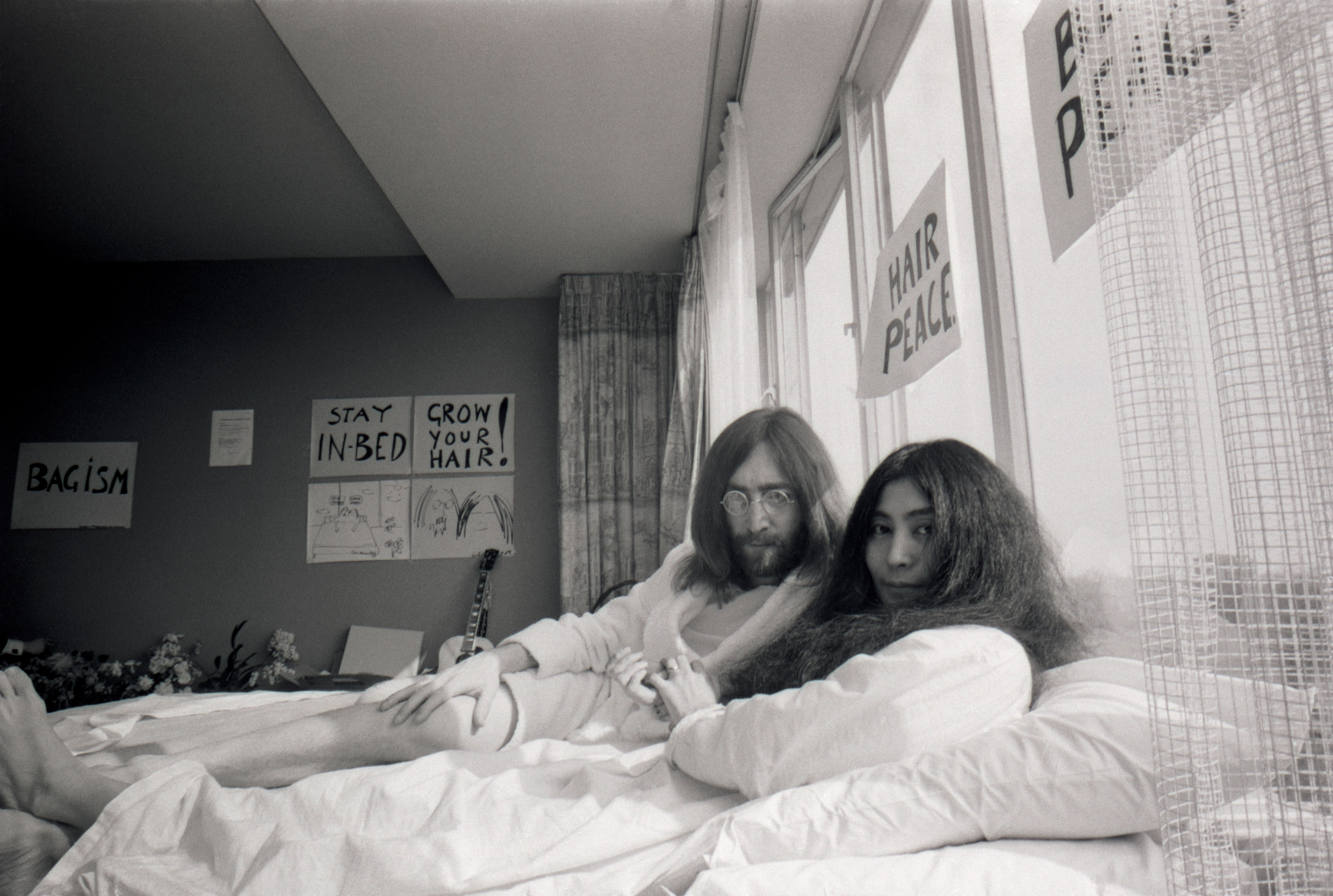 Artwork credits: Bed-In at the Amsterdam Hilton Hotel, Netherlands, 1969 Photograph by Henry Pessar © Yoko Ono; Installation view of Wish Tree, 1996, in Yoko Ono: Poetry, Painting, Music, Objects, Events, and Wish Trees, Poetry Foundation, Chicago, Illinois, 2019. Photograph by Jason Branscum © Yoko Ono; Installation view of My Mommy is Beautiful in Yoko Ono: Music of the Mind, Gropius Bau, Berlin, Germany, 2025. © Gropius Bau, photo: Luca Girardini. Artwork © Yoko Ono; Installation view of Yoko Ono's Apple, 1966, in Yoko Ono: Lumière de L'Aube, MAC Lyon, Lyon, France, 2016. Photograph by Blaise Adilon © Blaise Adilon Courtesy of Yoko Ono; Cut Piece, 1964, performed in New Works of Yoko Ono, Carnegie Recital Hall, New York, filmed by David and Albert Maysles, film, 16mm, black and white, and sound (stereo), 8min, 27sec. © Yoko Ono; Yoko Ono FLY, 1970/1971 Directed by Yoko Ono & John Lennon Score and concept by Yoko Ono Soundtrack by Yoko Ono & John Lennon Film, 16mm, colour and sound (mono) 25min © Yoko Ono