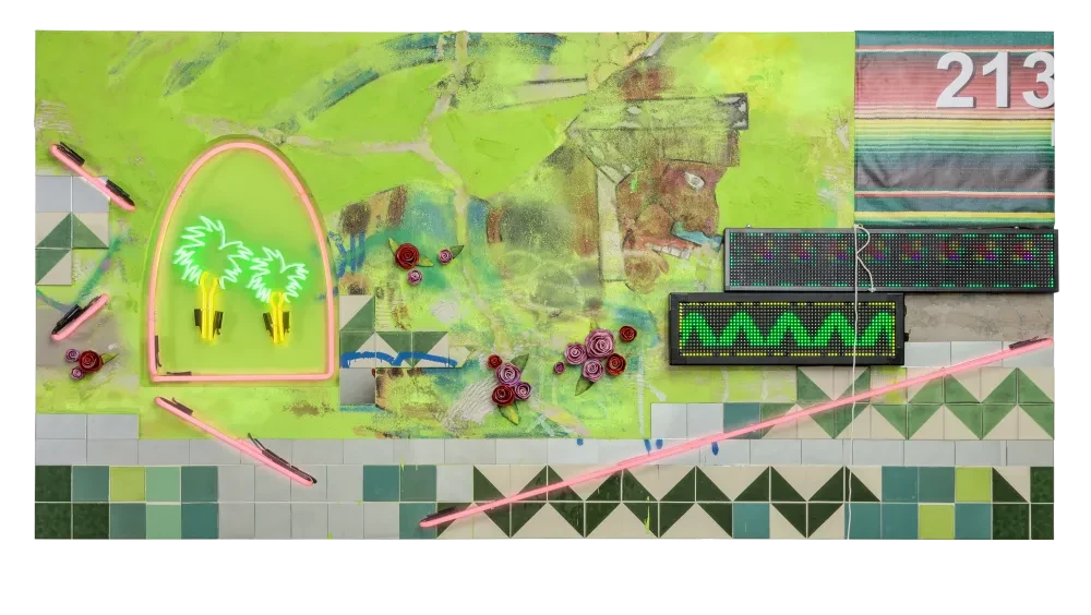Image Credit: Patrick Martinez. Weeping Warrior, 2022. Stucco, neon, mean streak, ceramic, acrylic paint, spray paint, latex house paint, banner tarp, rope, stucco patch, ceramic tile, tile adhesive, engraved mirror and LED signs on panel. The Broad Art Foundation, © Patrick Martinez